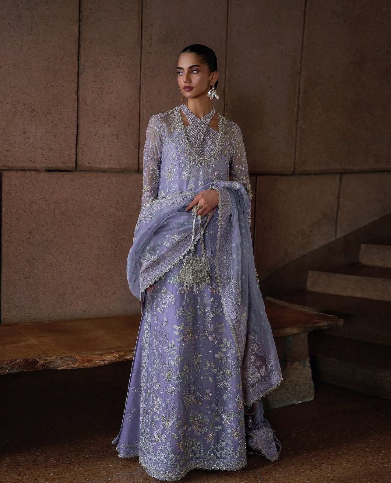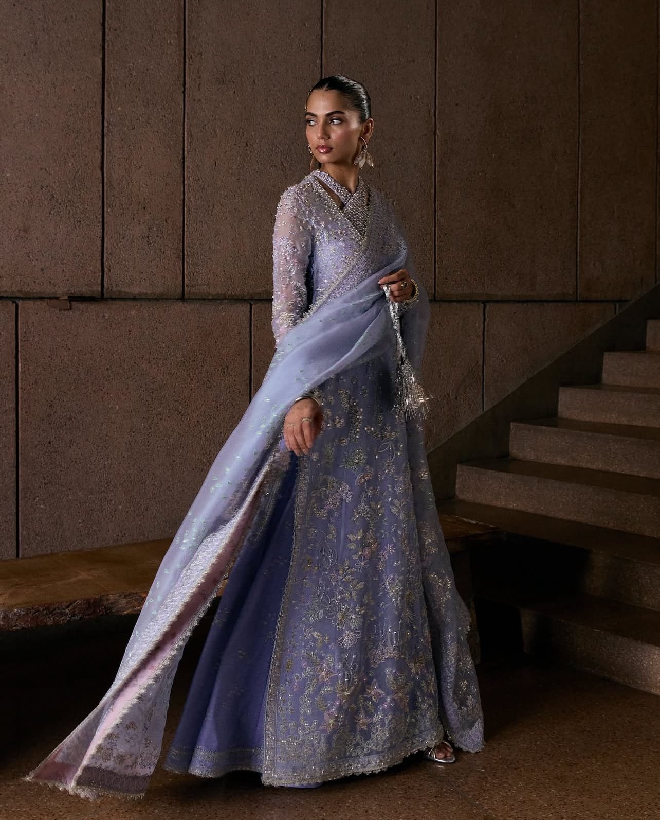 Soft periwinkle, this four-piece ensemble radiates grace. The organza long shirt with a crossover, embellished neckline with mesh detail over a printed pishwas, finished with tasselled borders and fitted sleeves. Paired with raw silk bell-cut pants and a richly embroidered organza dupatta with four-sided borders and lace finishes, the look is refined and radiant.”