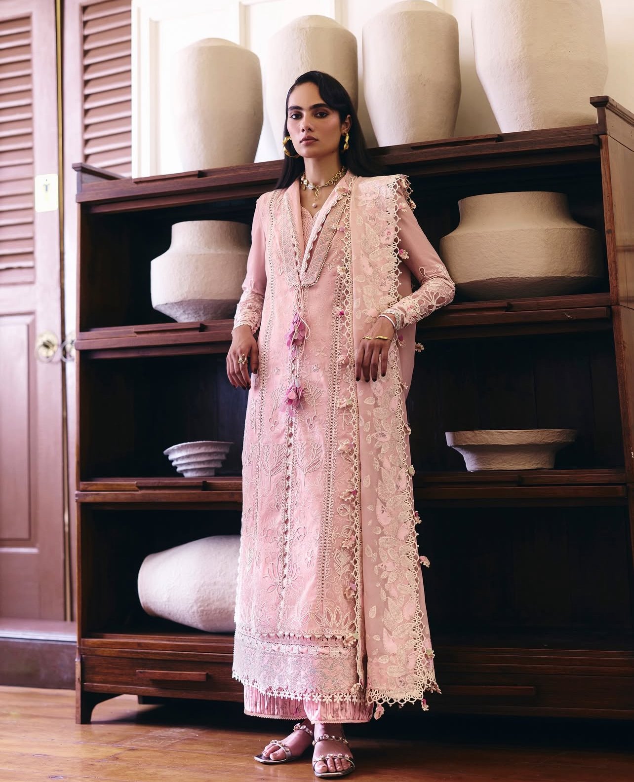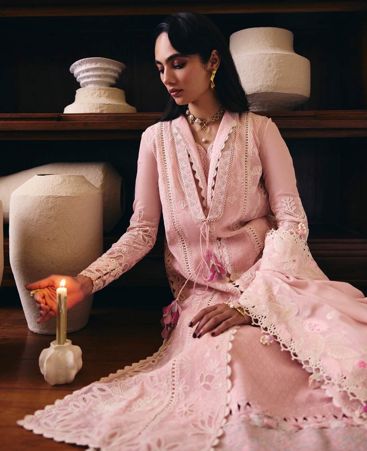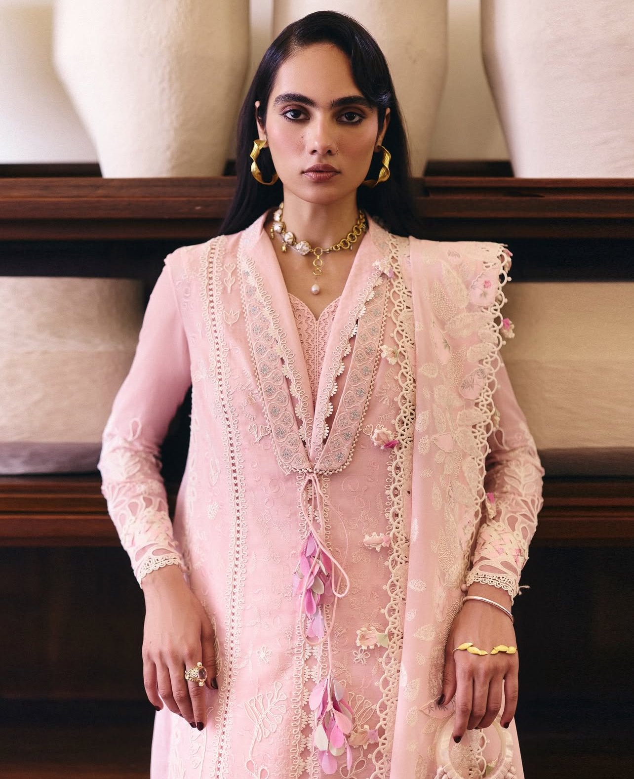 Mahae is a luxurious 4-piece Tea Pink ensemble. The double-layered paper lawn kurta, crushed floral culottes, and detailed chiffon dupatta offer beautiful variance and light elegance for your summer celebrations.