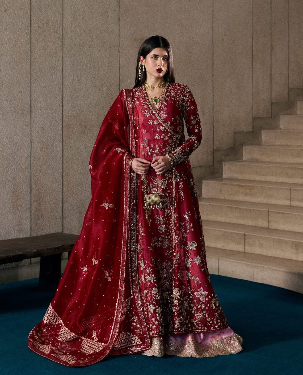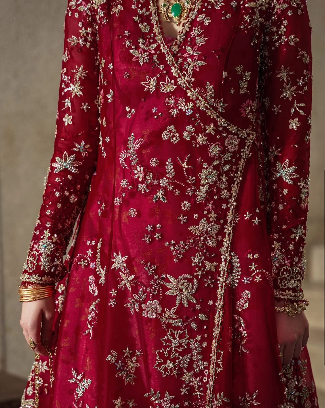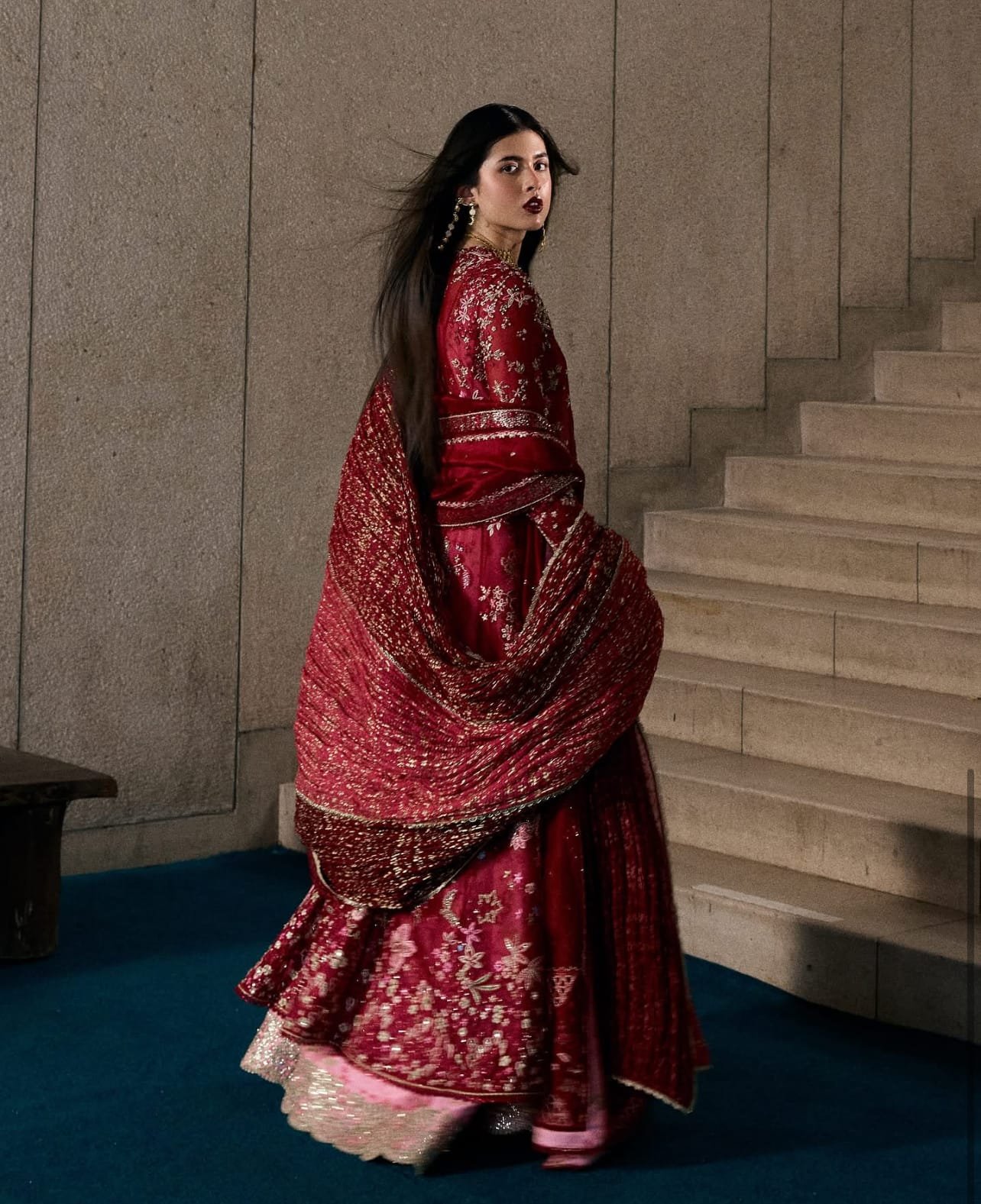 A rich wine-red ensemble featuring an angrakha-style front-open organza shirt with an overlapping V-neckline. Embroidered in pink, green, and gold, the shirt is accented with intricate lace on the hem and sleeves, finished with a front tassel, layered over a printed pink raw silk slip. Soft pink raw silk sharara pants feature scalloped sequin borders for a glamorous touch. The organza dupatta echoes the opulence with four-sided sequin patti and a heavily embroidered pallu adorned with chaand bali motifs and lace finishes.