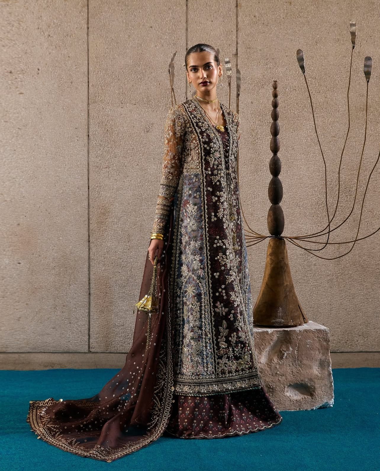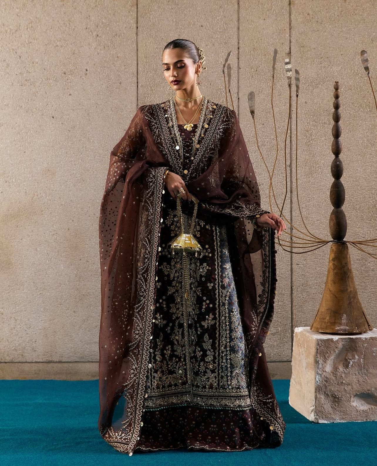 Drenched in deep brown tones, this four-piece set features a printed organza front-open multi-panelled, in grays and yellows that gradiate the brown, shirt with a square neckline. Embellished with golden sequins and hints of green, red, and white, the paneled design is finished with intricate laces, contrasting grey accents, and tassels. Styled with a printed grip silk slip and matching sharara pants with scalloped edges. The organza dupatta is adorned with self and gold embroidery, sequins, and a printed four-sided border with sequin tassels.